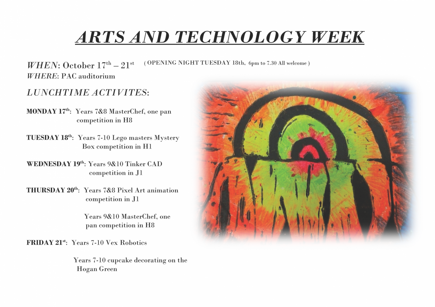 On Tuesday 18 October at 6pm we will begin with the principal, Mr Jamie Madigan formally opening the exhibition. From there you will be able to view students’ art and projects completed in Materials Technology, Media, and Food.