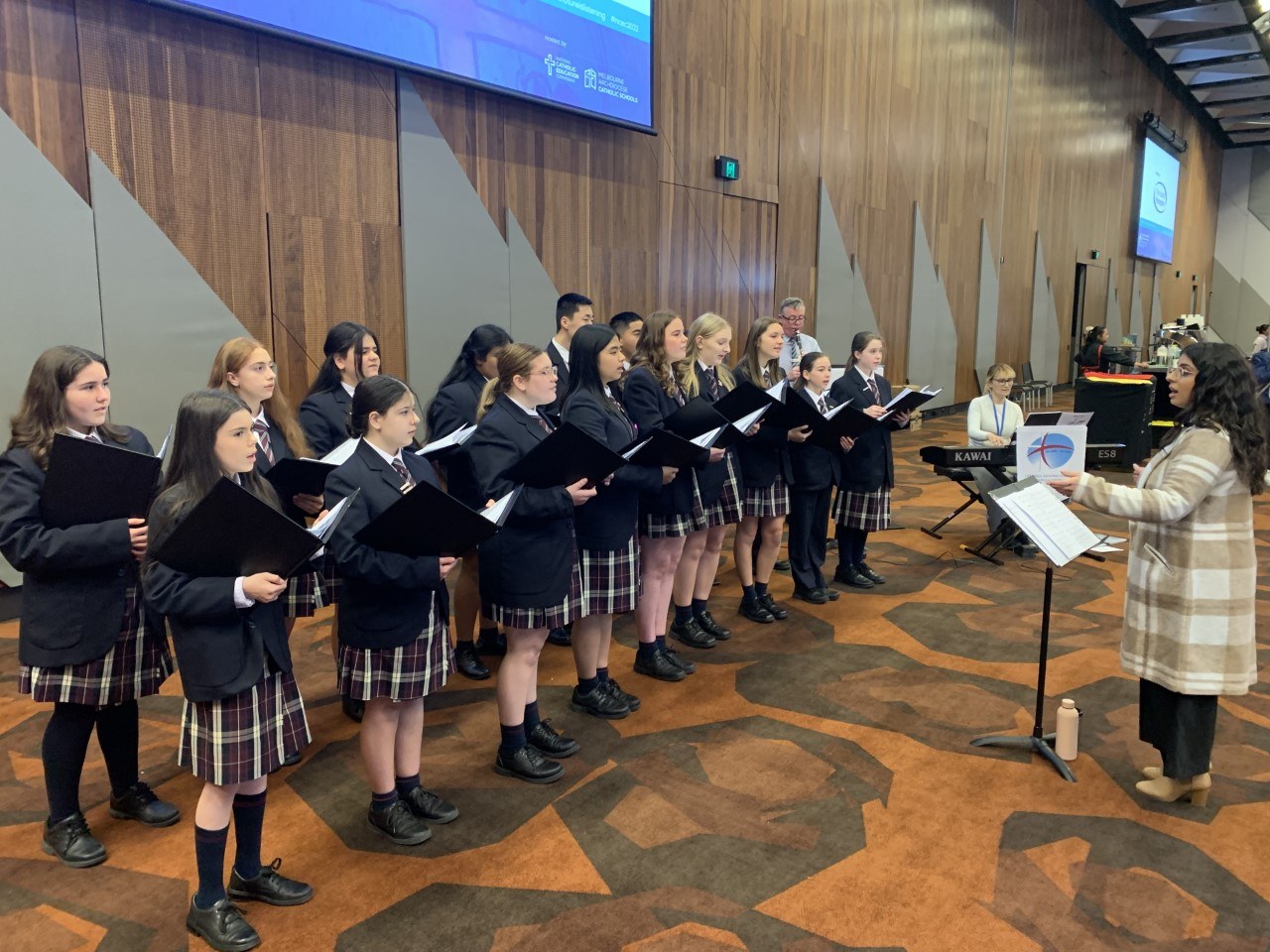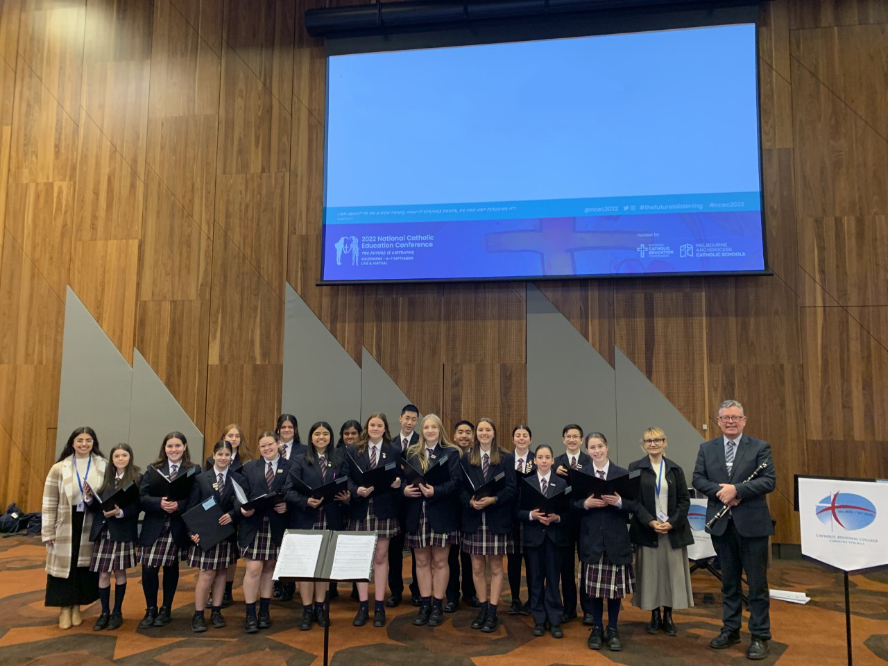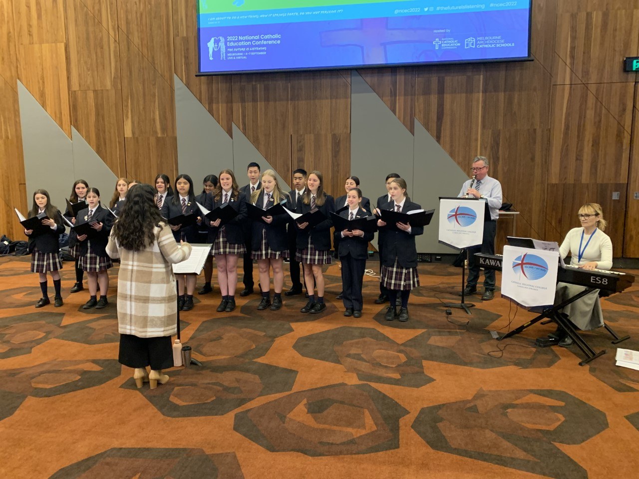 The College Chamber Choir was invited to perform at the 2022 National Catholic Education Conference on Tuesday 6 September at the Melbourne Conference and Exhibition Centre. Over 1400 delegates from around Australia and New Zealand were present at the Conference, and the Chamber Choir gave two performances during the day. Congratulations to all students involved and special thanks to Ms Elise Laguna (Chamber Choir Director) and Ms Maria Fiteni (Accompanist).