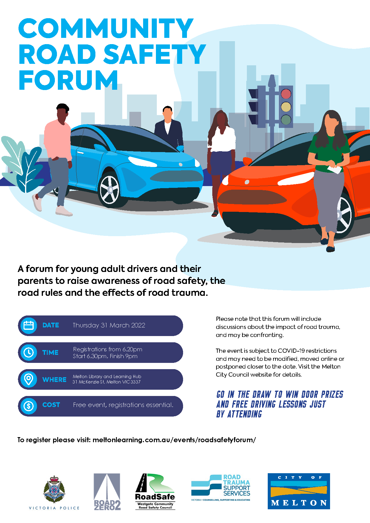 This is a brief reminder that next Thursday 31 March, the City of Melton is hosting a Community Road Safety Forum, targeting new or younger drivers between the age of 16 – 21 and their parent/guardians.