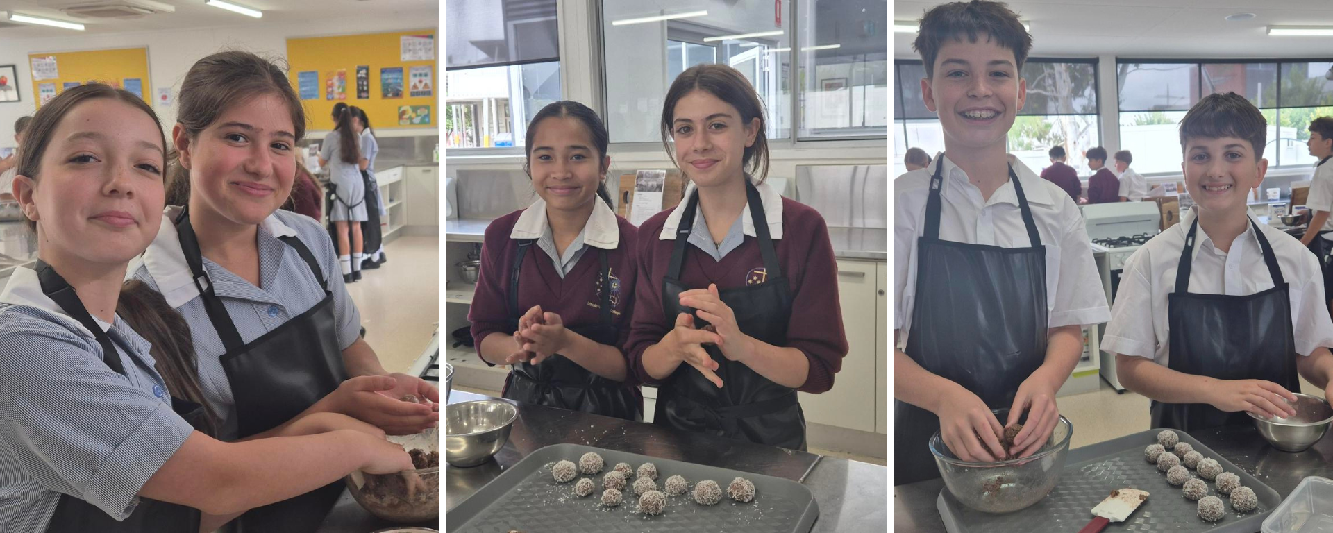 The Year 7s kicked things off by making the ever popular ‘Yum Yum Balls’, focusing on key kitchen skills such as safety, hygiene, and correct measurement techniques. This introduction to the kitchen helps them build confidence while learning the basics of food preparation.