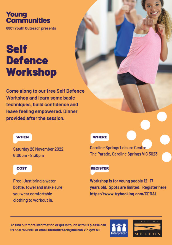 The 6801 Youth Outreach team are running a Self Defence Workshop at Caroline Springs Leisure Centre, Saturday 26 November from 6pm-8.30pm.