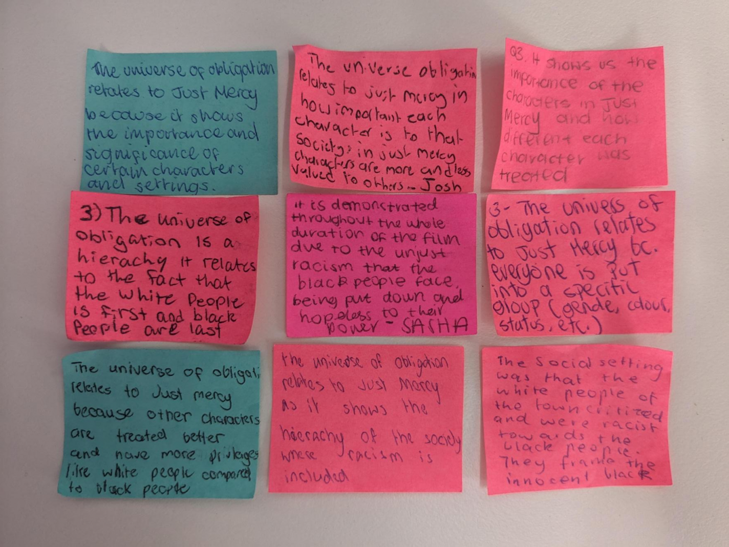 Recently a Year 10 English class reflected on their learning about social settings within the text Just Mercy by examining the ‘universe of obligation’ framework. Students ‘reviewed the initial goal’ by completing an exit pass, detailing their learnings from the lesson topic, as can be viewed below.