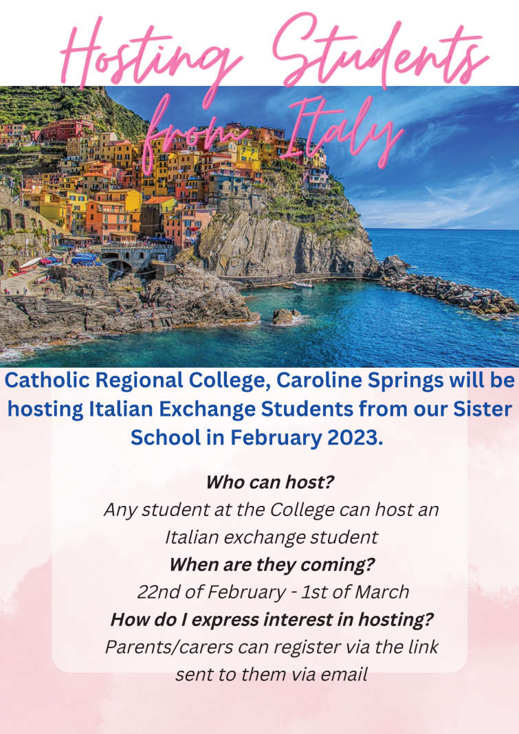 Catholic Regional College Caroline Springs is excited to be hosting Italian exchange students from our Sister School Liceo Scientifico Livio Cambi, Falconara Italy in February 2023 for one week. These students are aged between 14-15 years old and are fluent in English.