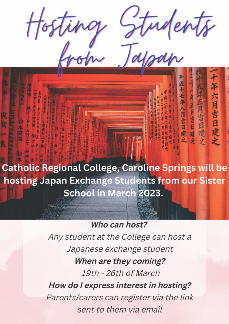 All families at Catholic Regional College Caroline Springs are warmly invited to host a Japanese Exchange Student from our Sister School Notre Dame Seishin High School.