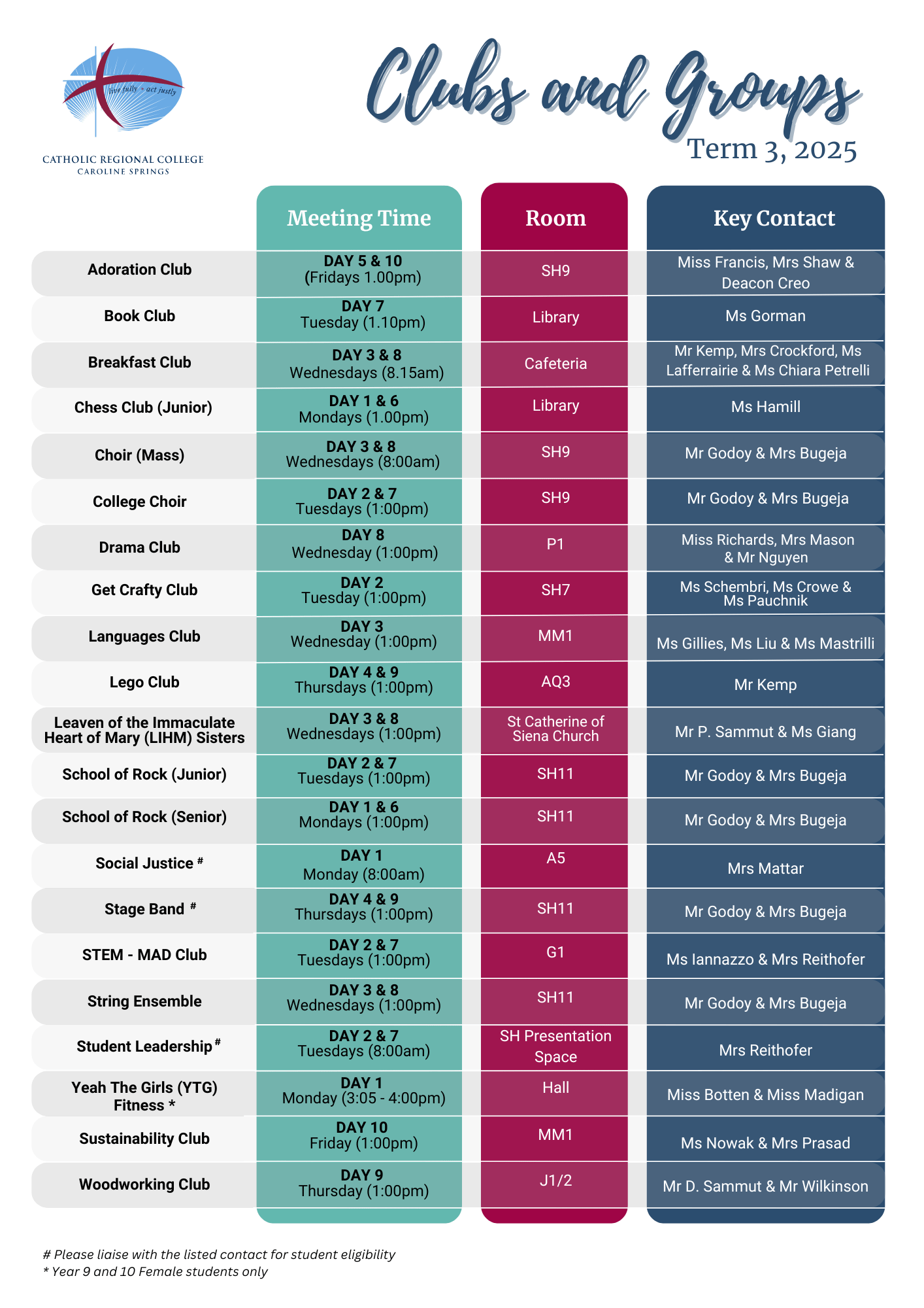 We are proud that at Catholic Regional College Caroline Springs, we offer an extensive range of co-curricular clubs and groups, as well as learning support programs, to all students. These offerings are an integral part of our holistic approach to education. I encourage parents to explore the opportunities with their child and consider which clubs, groups, or support programs they would like to engage in for Semester Two. A list of opportunities can be found below:
