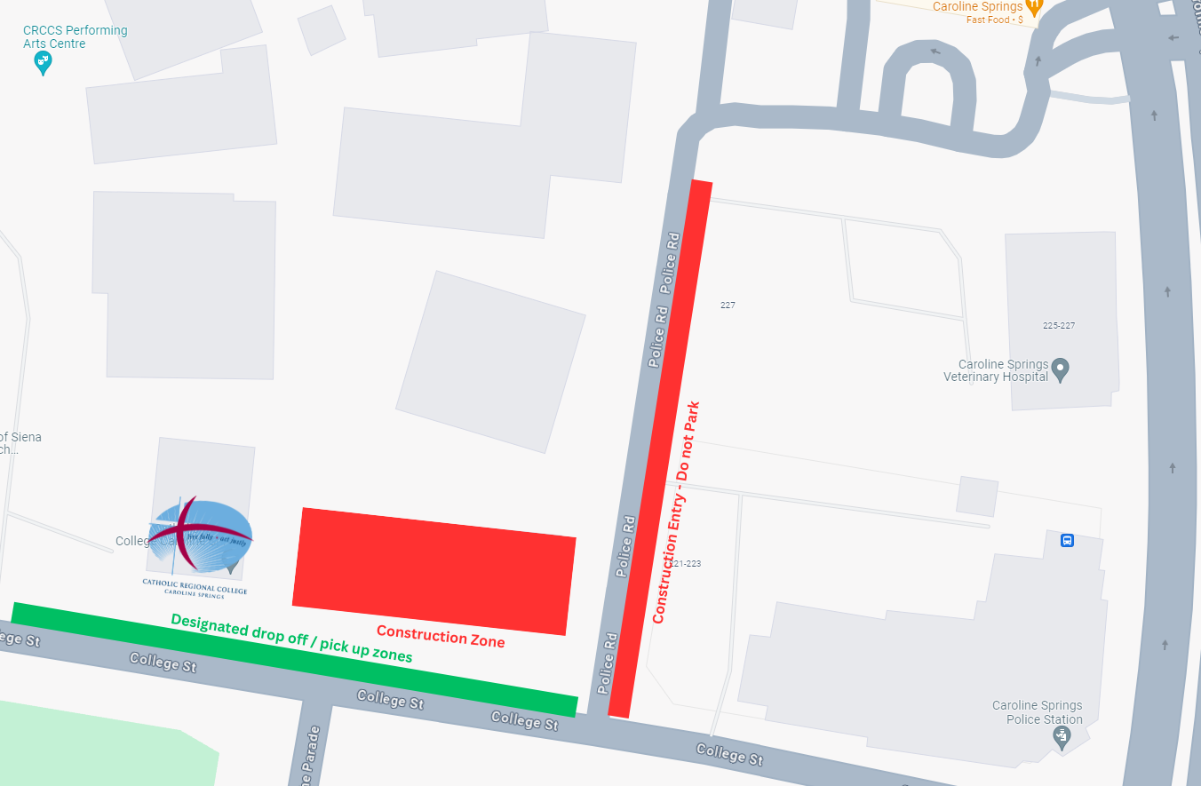 Can we kindly ask to be mindful of designated drop off and pick up zones around the school. With ongoing construction taking place, we ask that families do not park on Police Road as this serves as an entry point for construction vehicles. Please also be reminded that the Caroline Springs Veterinary Clinic is private property and for vet patrons only, and that the College staff car park is not a designated area for student drop off and pick up.