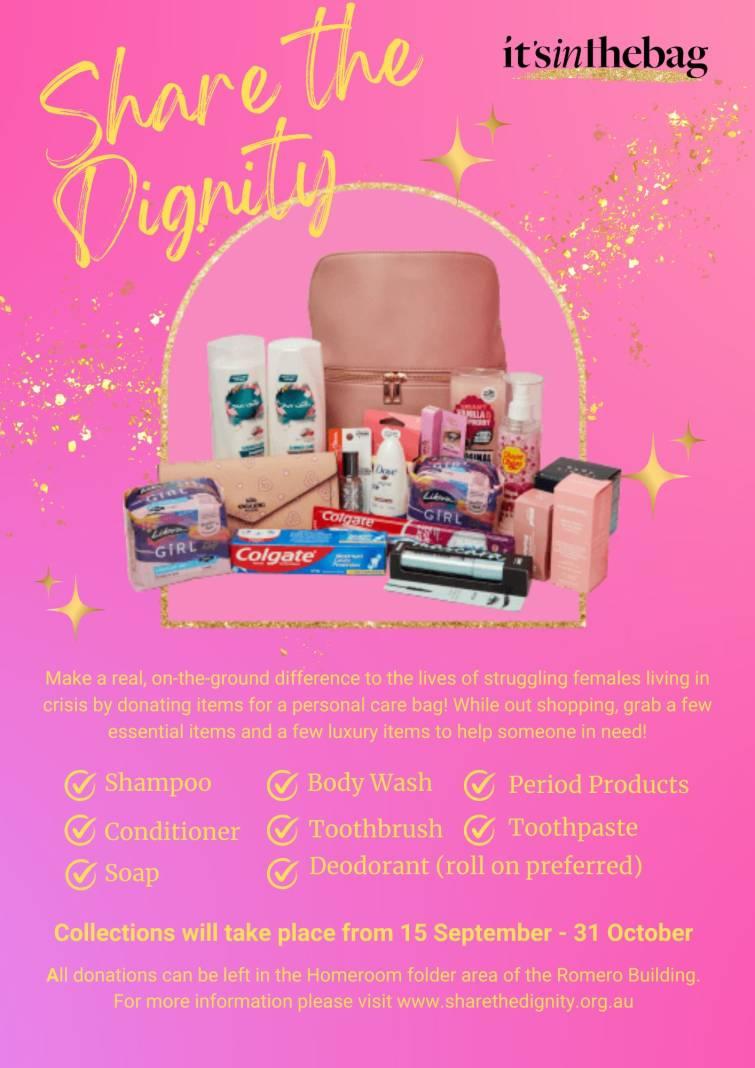 Next term, our school community will come together to support ‘Share the Dignity – It’s in the Bag’. We are calling on everyone, in our generous community, to contribute, because every donation, big or small, makes a massive difference.