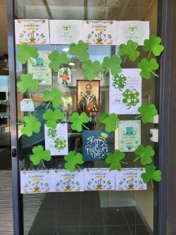 The Social Justice team made sure to celebrate this wonderful saint, they put up a wonderful display for all the community to see, with lots of three leafed shamrocks. This is symbolic of the saints teaching on the Holy trinity the three in one God, which is symbolised with the three leaves in one plant.