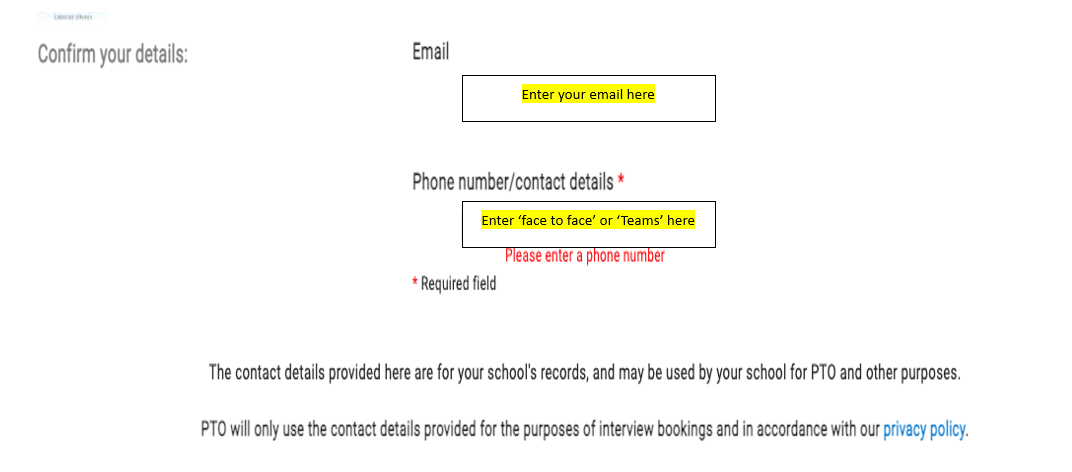 When booking via PTO, parents/carers will enter their interview mode preference in the ‘Phone number/contact details’ field, as shown by the image below.