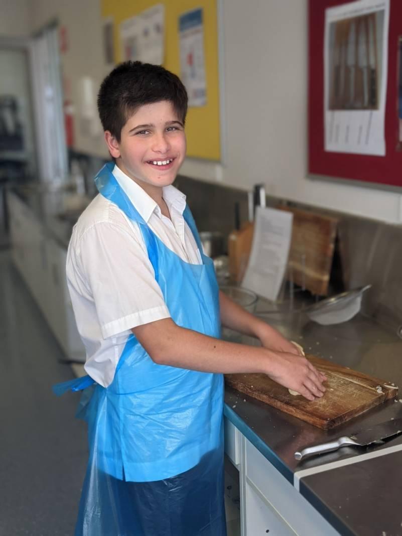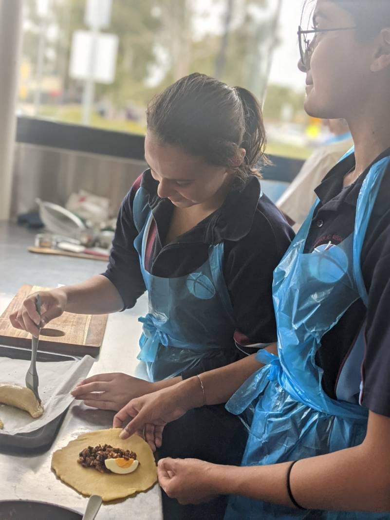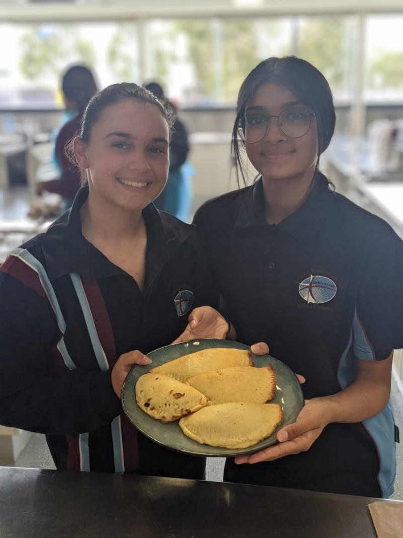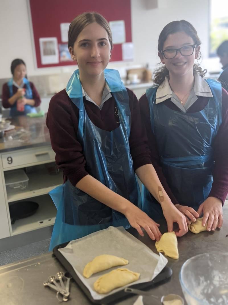 A simple task such as feeding the arborio rice with small amounts of hot liquid, allows us to watch the patience and love put into the dish. No two risottos looked alike, yet all were enjoyed. It was great watching the Year 9 students gently knead the dough prior to turning it onto a floured bench top to make their empanadas (stuffed bread or pasty). We then had the Year 8’s making the perfect sponge cake, this recipe was a real success.