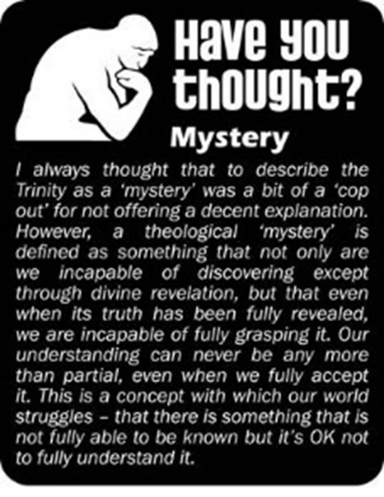 The Holy Trinity is referred to as the ‘mystery of our faith.’ In our Catholic faith a ‘mystery’ is a divinely revealed truth that we cannot fully understand by our finite mind because it derives from God. The point is even though we cannot ‘fully’ understand the mystery of the Trinity, we can still come to know aspects of it as revealed by Christ and His Church. The catechism of the Catholic church states, “The Trinity is One. We do not confess three Gods, but one God in three persons: [Father, Son, and Holy Spirit] … The divine persons do not share the one divinity among themselves, but each of them is God, whole and entire” (CCC, 253).